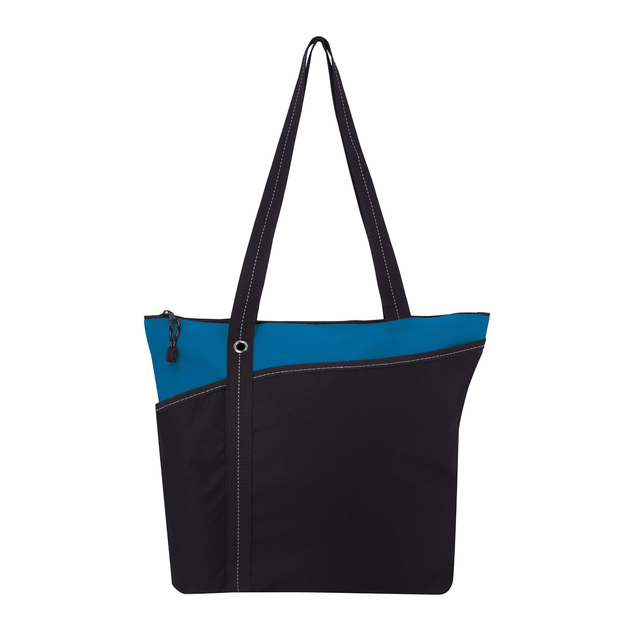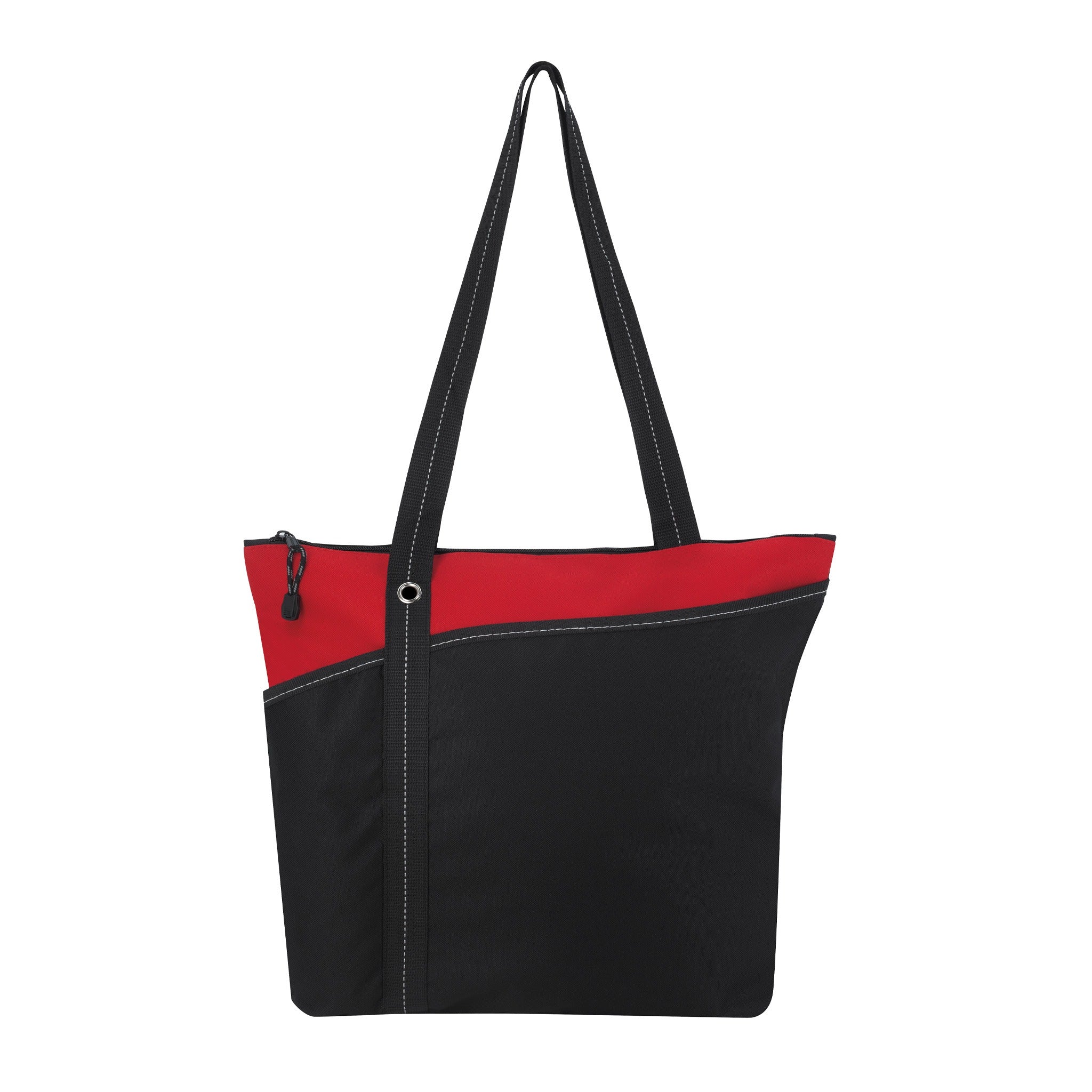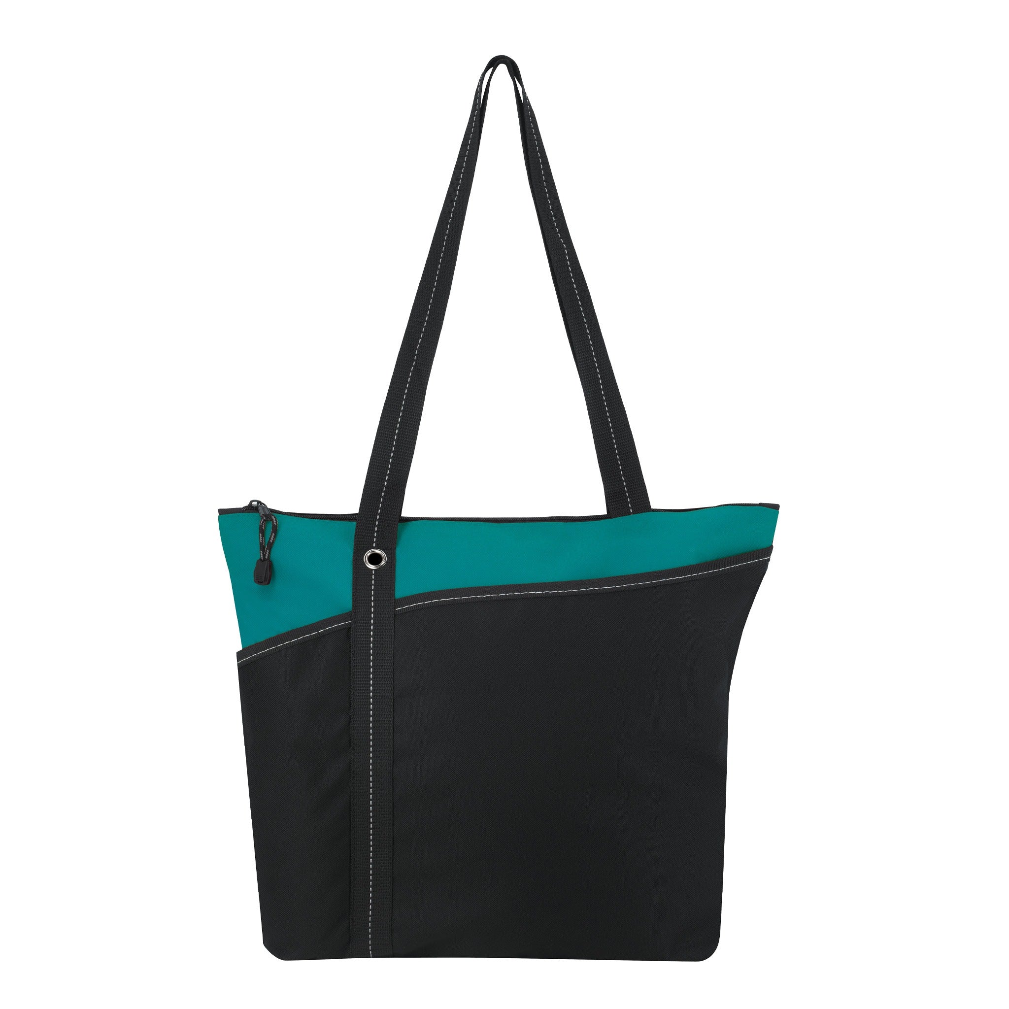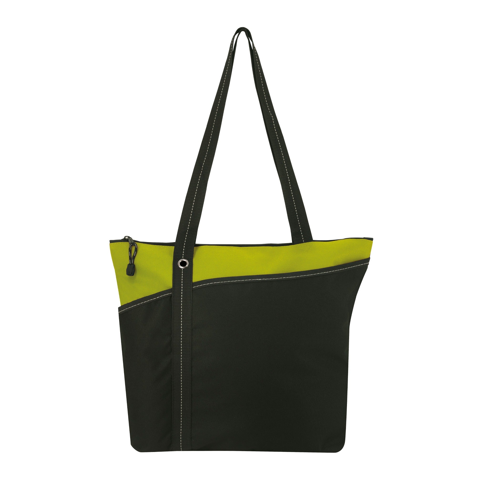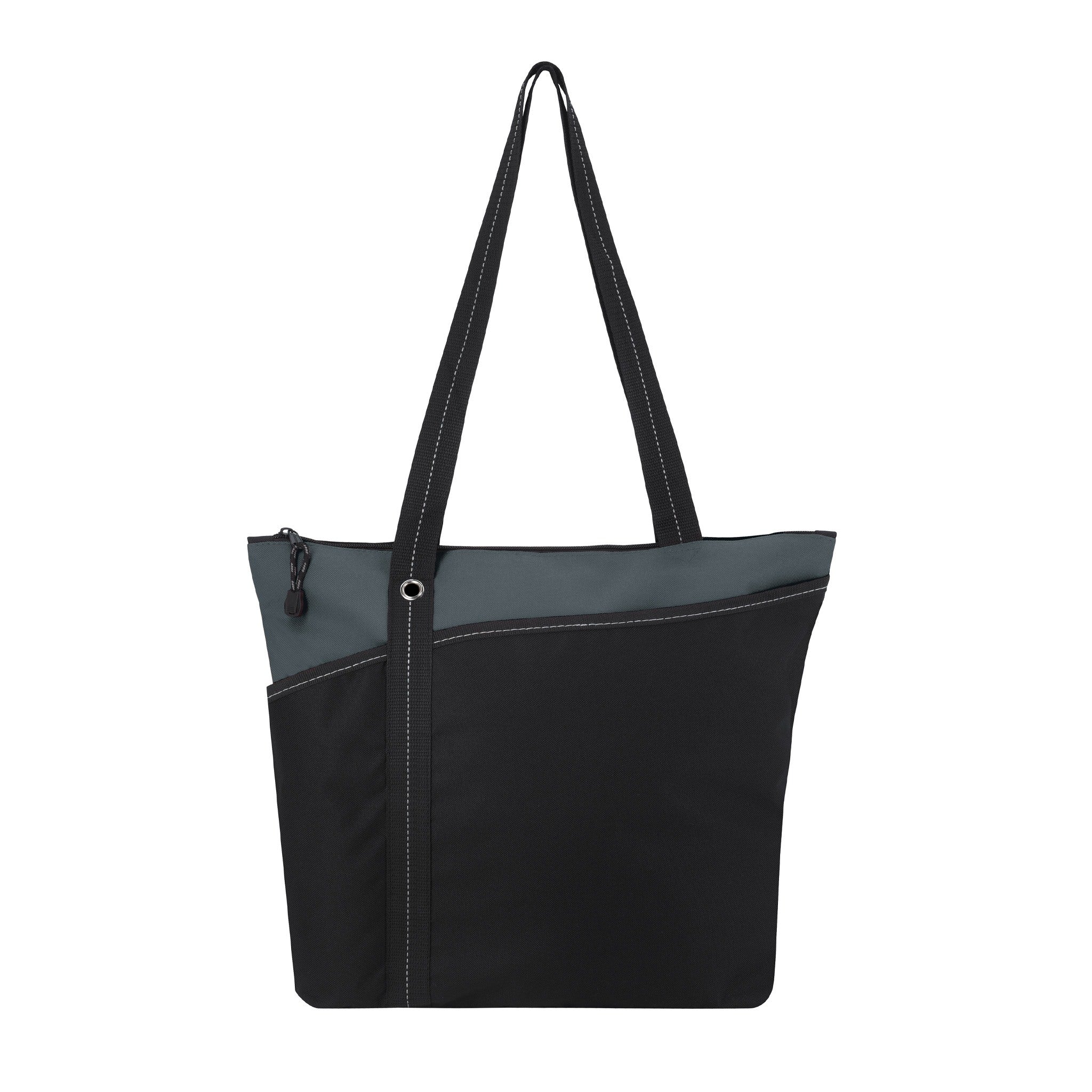 Introducing the Atchison® Annie Tote Bag - where style meets functionality! This custom tote is perfect for anyone on the go, whether it's attending tradeshows, carrying daily essentials, or promoting a brand. Made from durable 600D polyester, it features a roomy zippered main compartment to keep your items secure, along with two handy front slip pockets for quick access to smaller items. The shoulder-length handles provide comfortable carrying, and the grommet and stitching accents add a touch of sophistication.