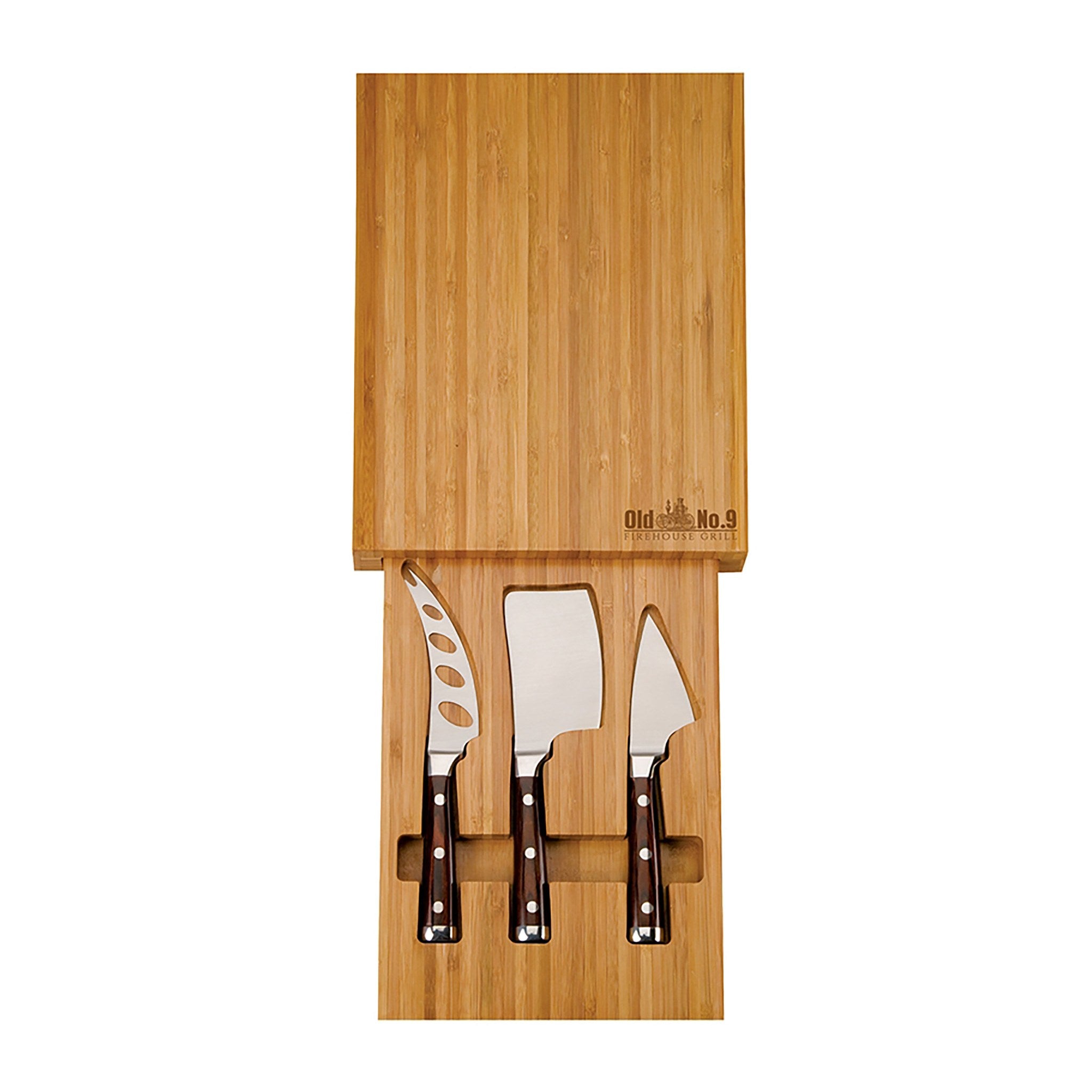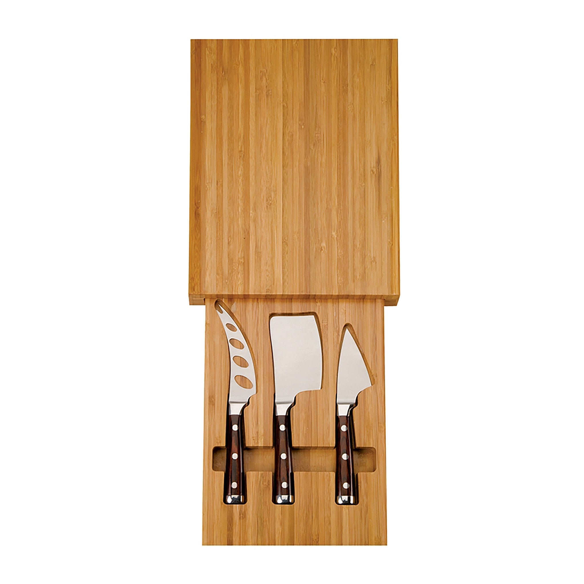 Let your branding hit your customers' homes with this custom bamboo cheese set! This set includes a bamboo cutting board with a hideaway storage drawer that can keep the cleaver, serrated knife, and cheese knife included in the set. All knives are made of stainless steel and the set can be personalized with your logo or brand. It's excellent for food or kitchen-related promotions and events. Great as an appreciation gift or reward too!