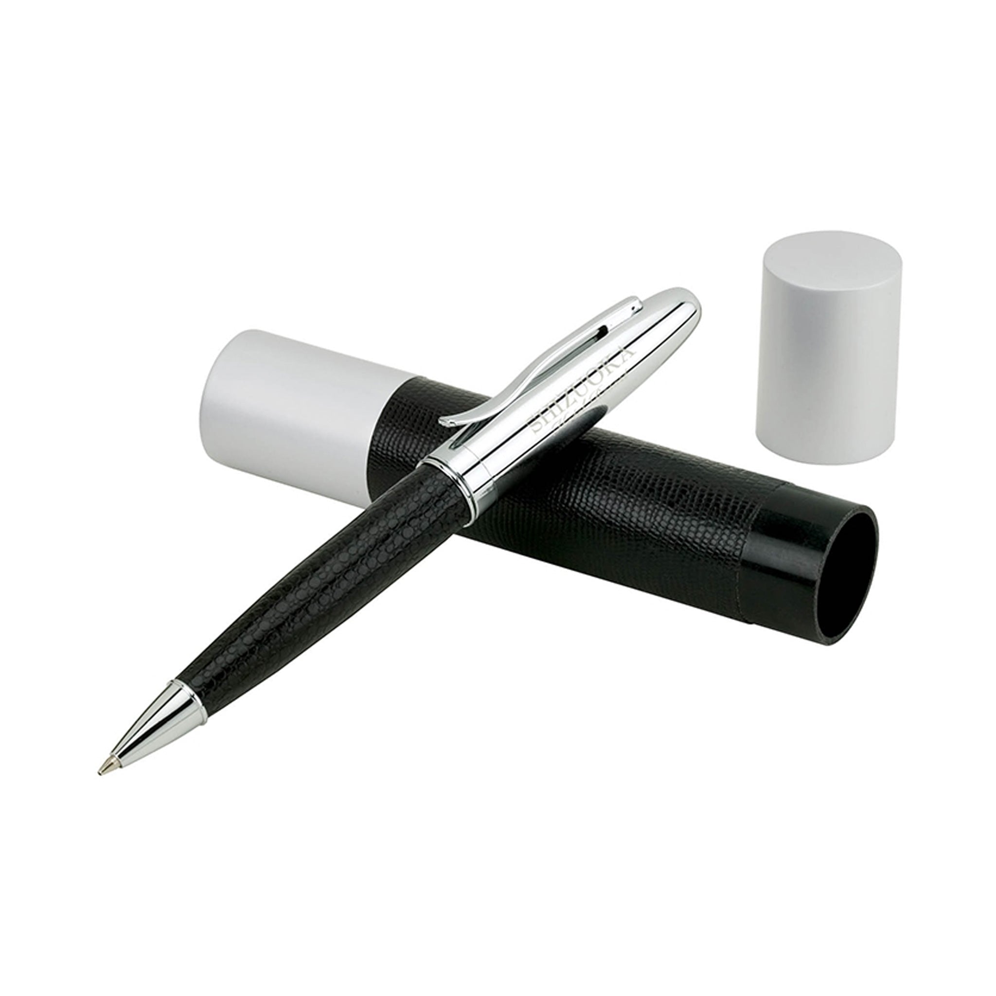 Here's an extra special take on executive pens! This promotional ballpoint pen comes with a matching tube case, making it easier to hand it out as a gift. This black ink pen has a twist action mechanism, brass cap, leatherette wrap, and chrome trim. Personalize this pen with your logo to complete its branded look. It's an excellent corporate gift for guests, clients, or deserving employees suitable for any occasion.