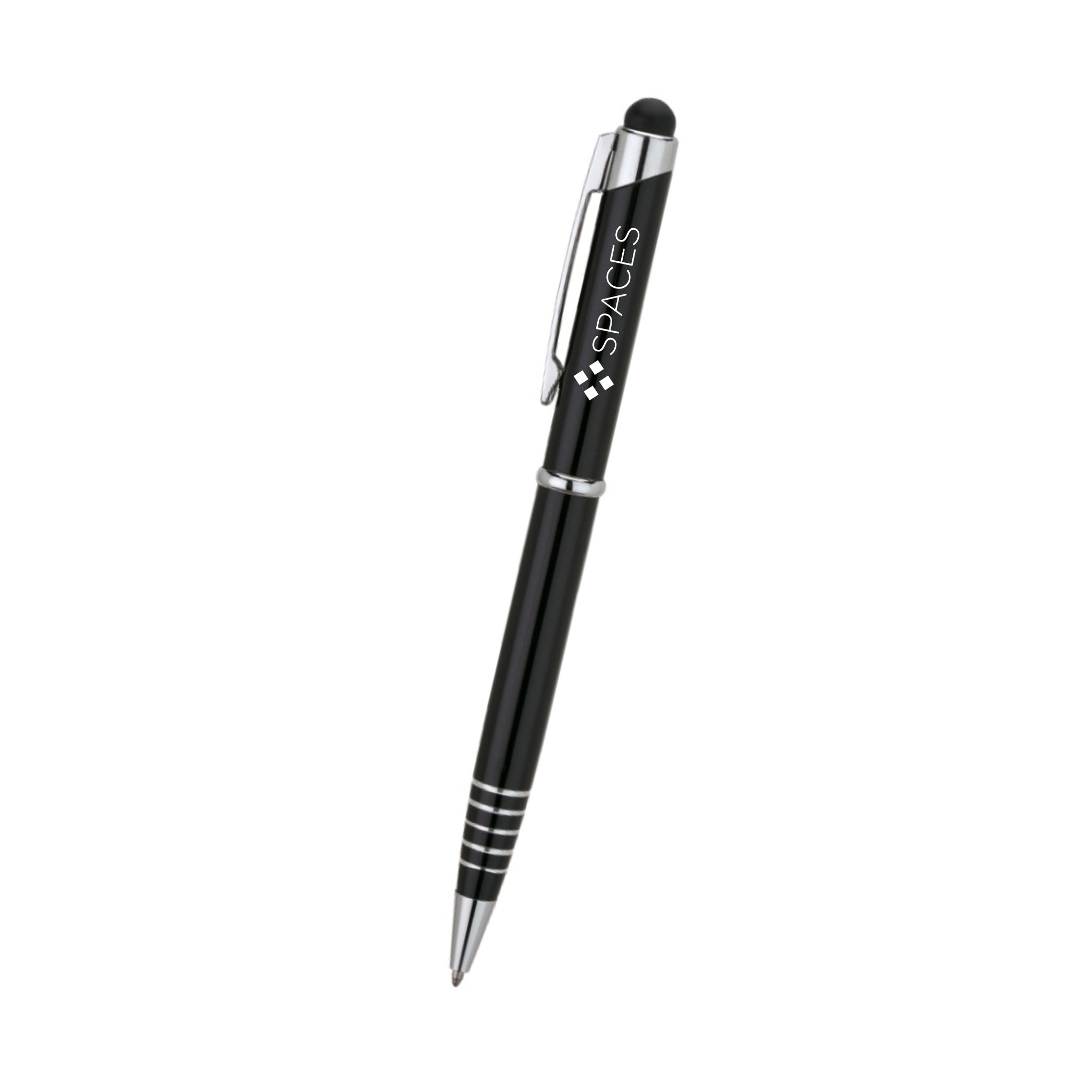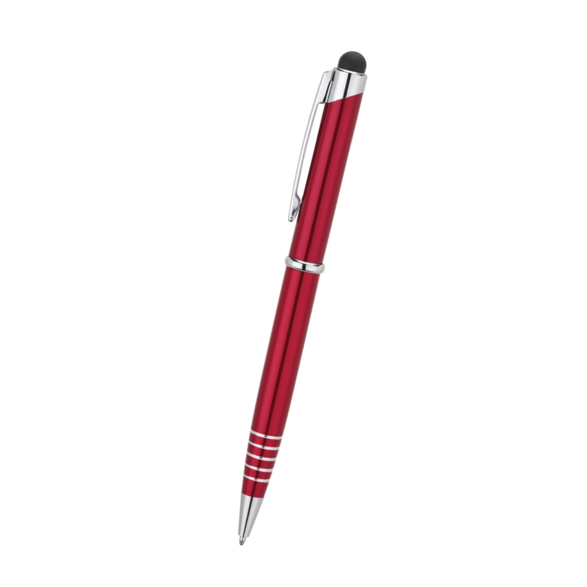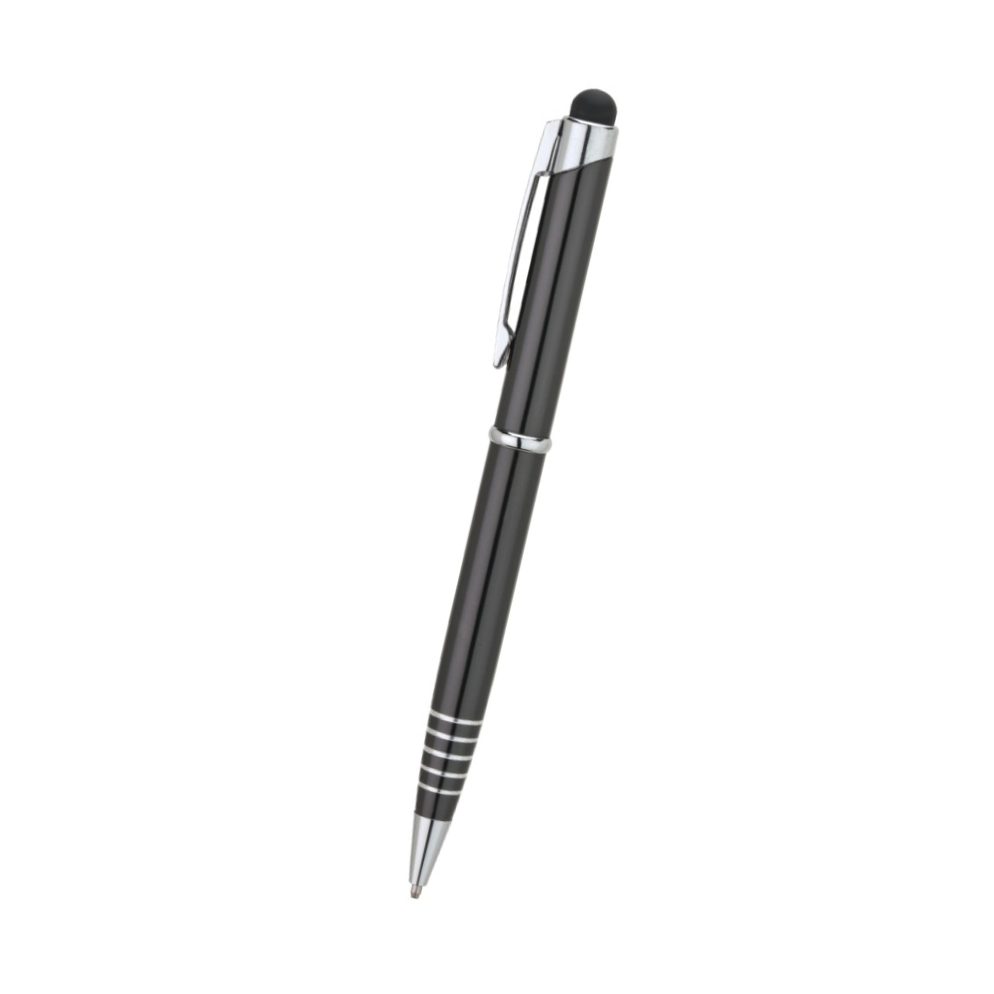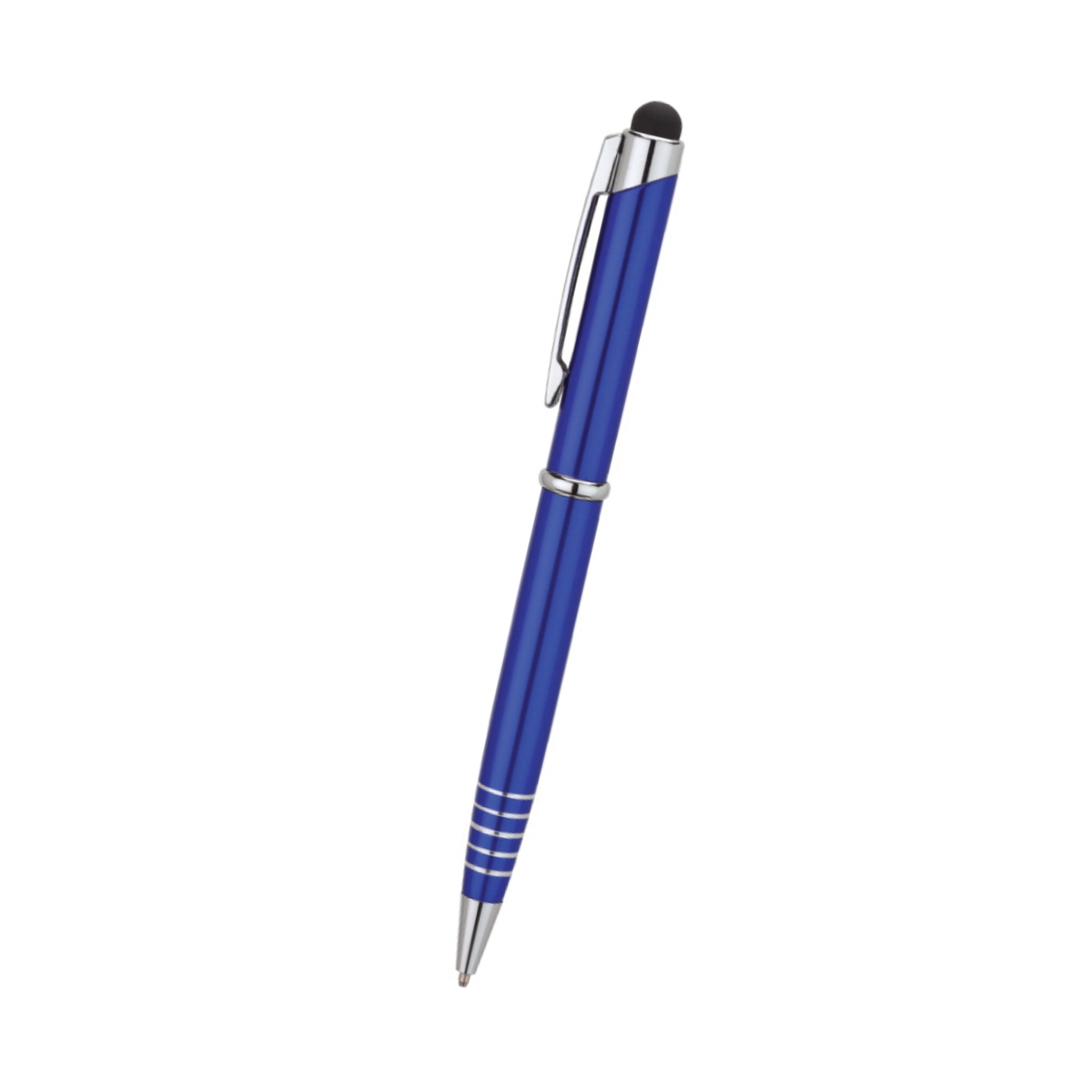 Promotional pens just got better with this customized stylus pen! This twist action ballpoint pen includes a capacitive stylus that's compatible with most touch screen devices. Its aluminum case, etched ring grip, and chrome clip and trim gives this pen a stylish and sophisticated look. Have it laser engraved with your company logo and you have a handy giveaway to customers and employees. They're also ideal for meetings, conferences, and conventions.