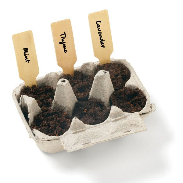 - Write on the wooden stakes, to identify the seed type in each compartment.