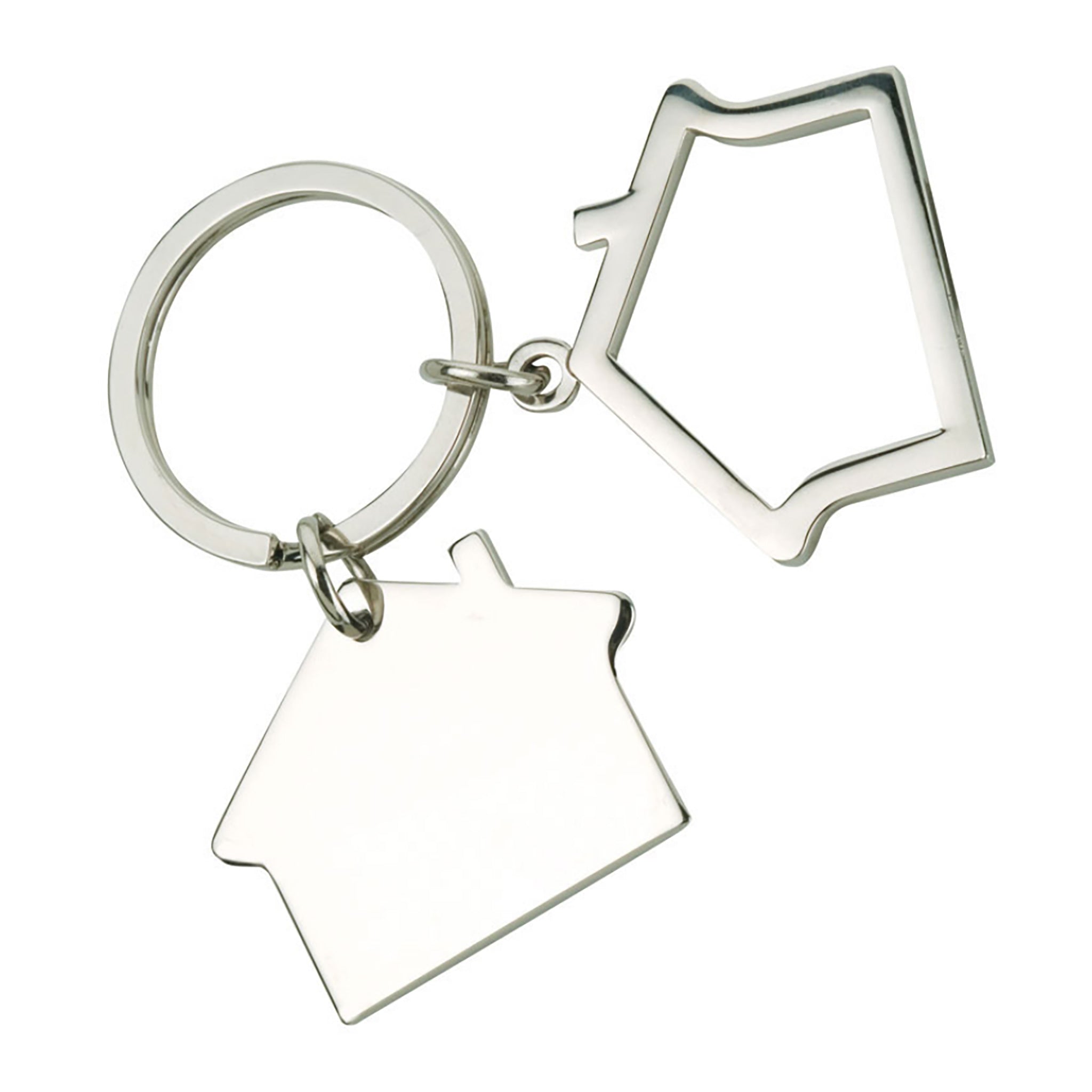 Unlock the door to effective branding with our Custom House Shape Key Chain, a promotional item that combines functionality with a touch of elegance. Crafted with precision, this key chain features dual house shapes—a solid and an outline—both finished in shiny nickel for a sleek, sophisticated look. Perfect for real estate agencies, construction companies, home services, or any business wanting to convey a sense of home and stability.