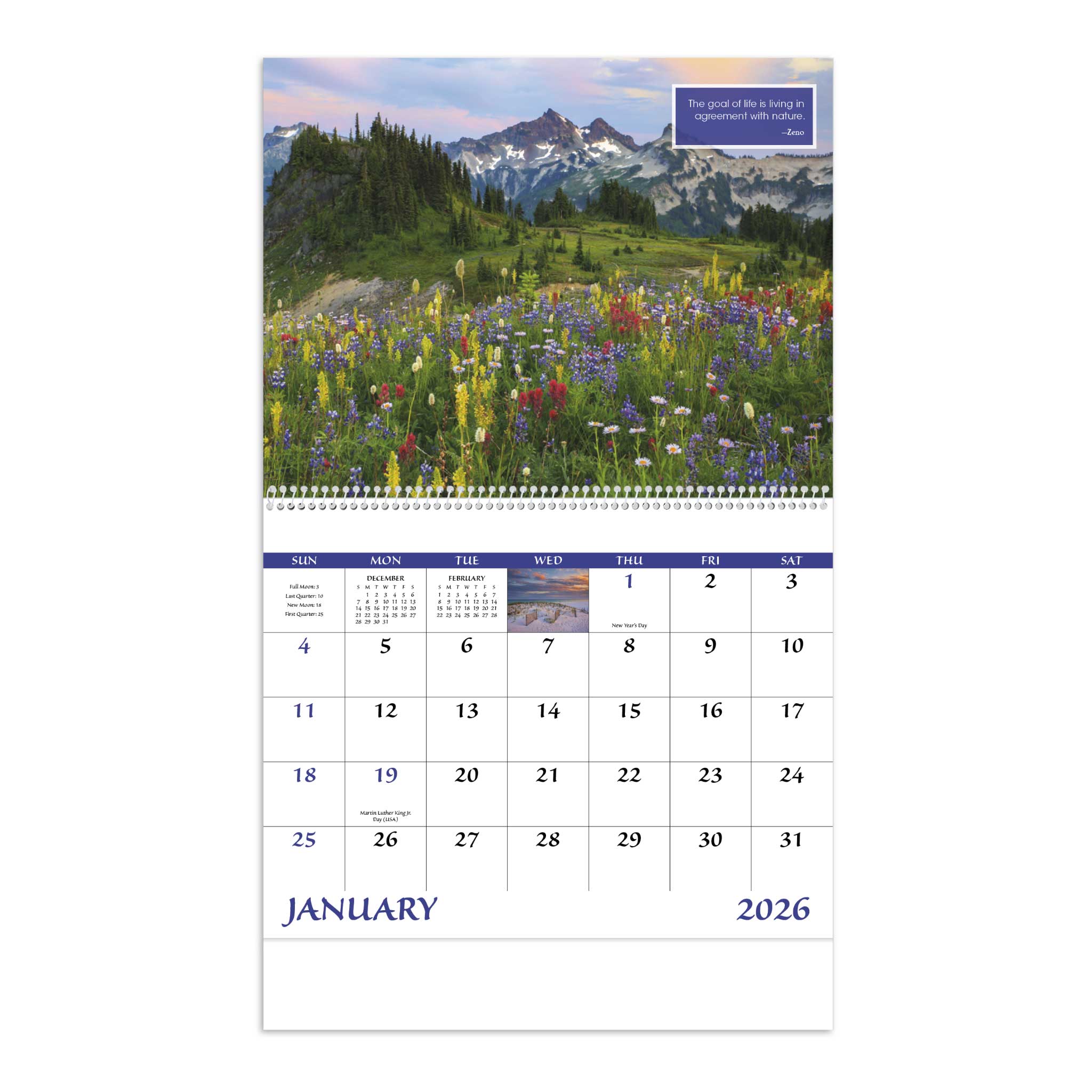 Brighten up any space with the Custom Inspirations for Life Spiral Calendar! Featuring high-quality imagery and uplifting messages, this 13-month calendar (December included on the backmount) is a great way to keep your brand in front of clients all year long. Made from gloss paper stock with a UV-coated cover, it offers a sleek, professional look, making it a perfect promotional gift for financial institutions, retail businesses, insurance agencies, and more.