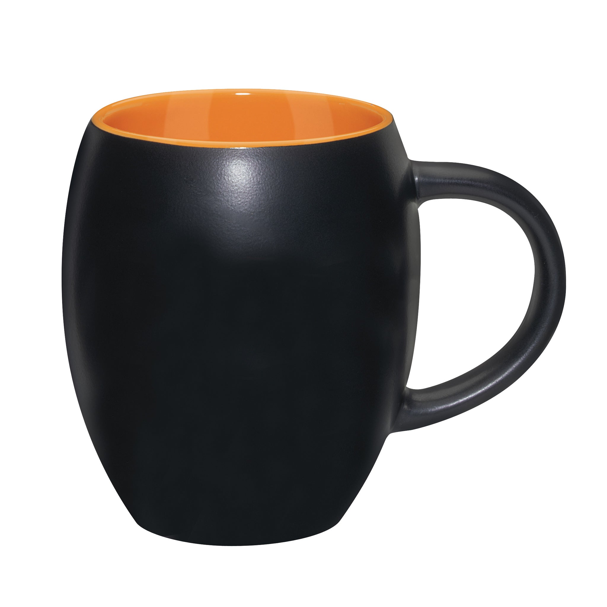 Matte is the new look, even in classic mugs! This barrel-shaped mug features a matte-finish black exterior with a color interior to provide that attractive contrast to your favorite beverage serving! It has a 17 oz. capacity when filled to the rim and is made of durable ironstone ceramic. Choose from 3 available interior colors and have your logo or brand imprinted on one or both sides of this amazing mug. Great as a corporate giveaway or event souvenir.