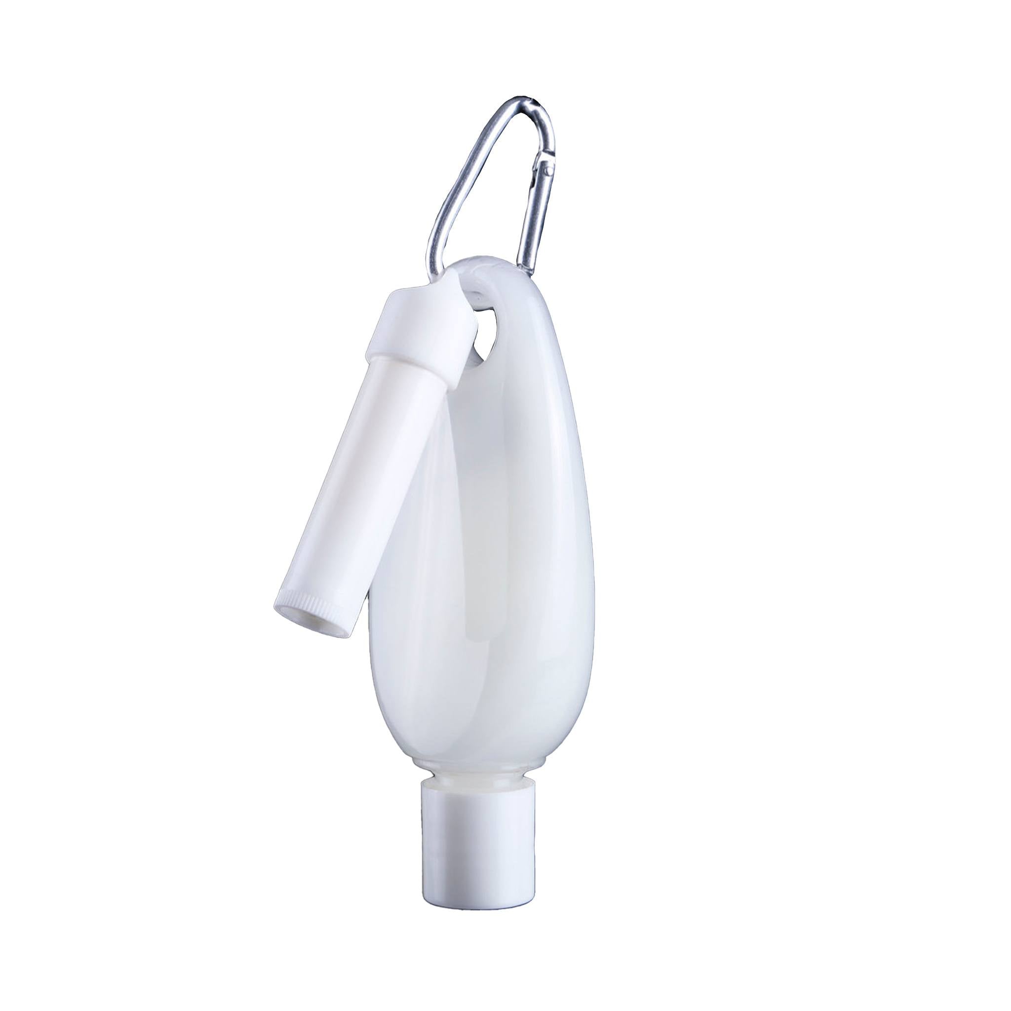 - Made of plastic tube & bottle; silicone cap cover; metal carabiner.