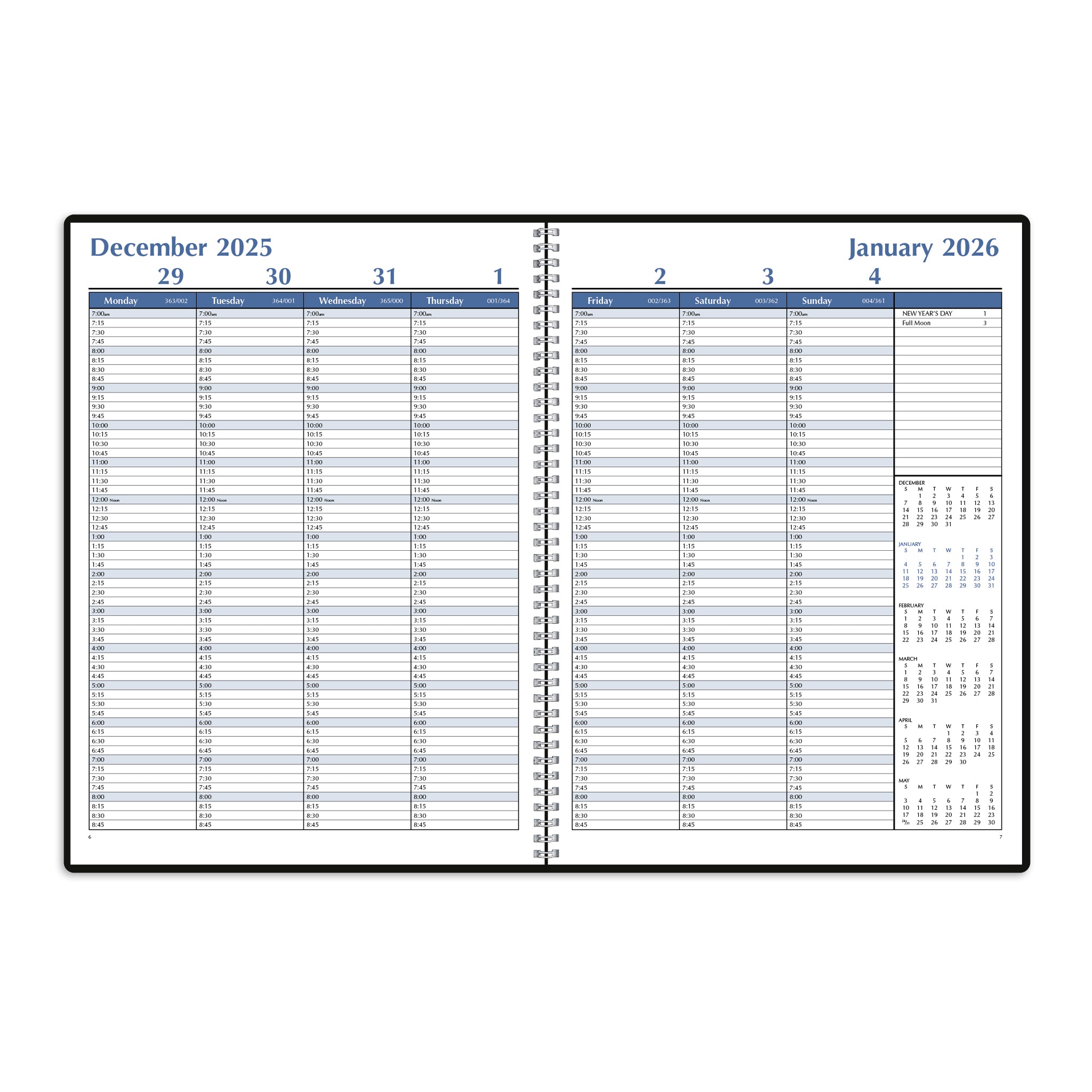 - Detailed Time Slots: Each day is divided into fifteen-minute slots from 7 a.m. to 8:45 p.m., allowing for precise and efficient time management.