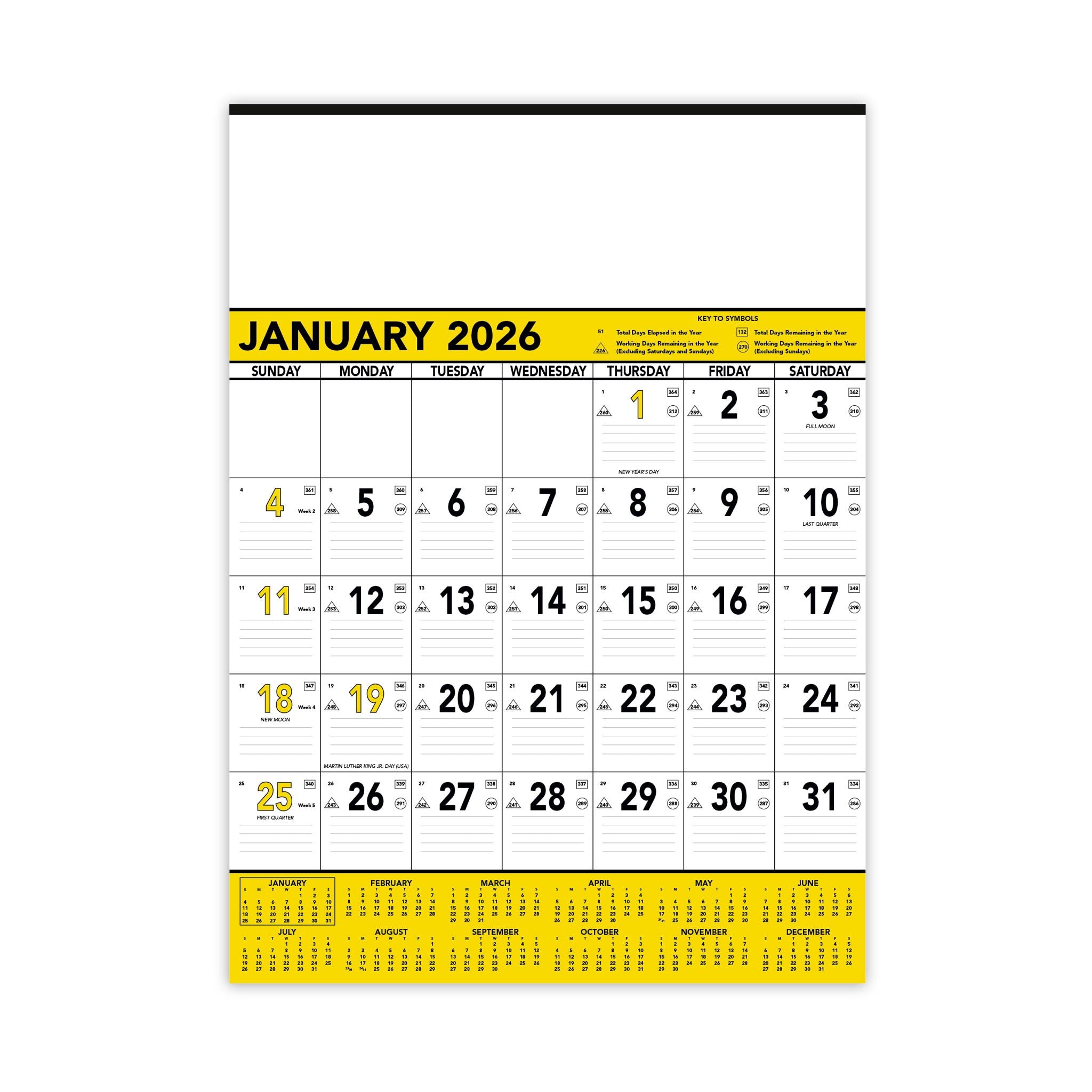 - Its date blocks feature faint ruled lines along with symbols denoting the days elapsed and remaining in the year, work days remaining without Sunday & Saturday, and days remaining without Sunday.